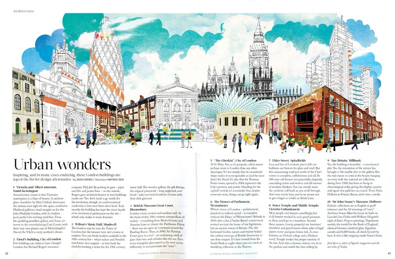 illustrations for Harrods Magazine I was asked to draw a cityscape of London for Harrods Magazine Spring/Summer 2015 issue. Here is the cover of HARRODS ESTATES. and a double spread image for the article written by Josh Spero titled 'Urban wonders'.